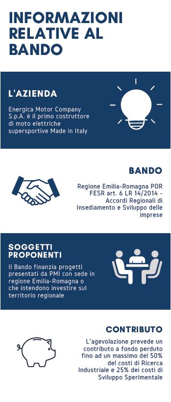 In questo contesto, Energica Motor Company S.p.A., azienda leader mondiale nella costruzione di moto supersportive elettriche, comunica di essersi aggiudicata il bando della Regione Emilia Romagna che promuove gli investimenti in ricerca e sviluppo sul territorio